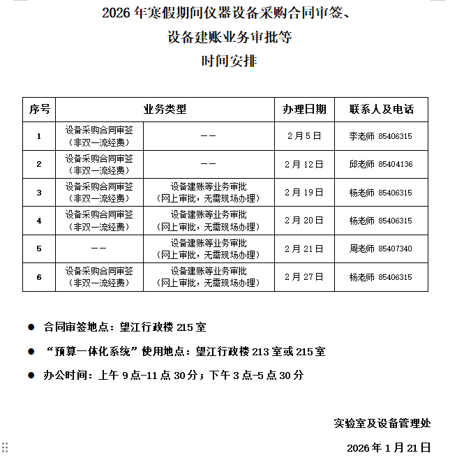 实验室及设备管理处2026年寒假期间仪器设备采购合同审签、设...