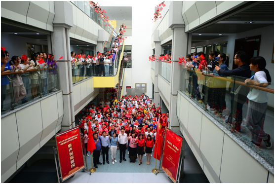 9月30日上午,实验室及设备管理处、灾后重建与管理学院的师生和“实验室安全与环保”通识课程的200余本科生,在课间纷纷走出教室,汇集在学院的楼道,手中挥舞着鲜艳的五星红旗,伴着耳熟能详的旋律,共同唱响《我和我的祖国》这首令人心潮澎湃的歌曲,为祖国70周年华诞献上最诚挚的祝福。