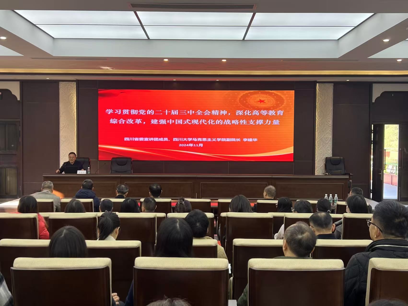 11月20日上午,实验室及设备管理处党支部、资产管理处党支部、发展规划处党支部、审计处党支部联合举行了学习贯彻党的二十届三中全会精神暨全国教育大会精神宣讲会,邀请学习贯彻党的二十届三中全会精神省委宣讲团成员、四川大学马克思主义学院副院长李建华副教授作了专题辅导报告。四个党支部党员参加报告会。