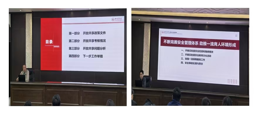 徐明副处长总结了2024年全校大型仪器设备开放共享工作总体情况和存在的问题,对科技部2025年“重大科研基础设施和大型科研仪器开放共享评价考核”工作进行了布置。实验室及设备管理处陈炳周副处长首先对2024年实验室安全环保工作作了总结汇报,并对2025年实验室安全环保工作作了强调和布置。