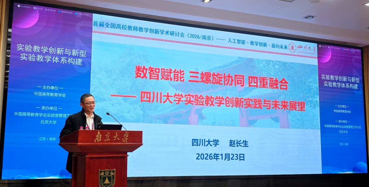 1月23日,首届高校教师教学创新学术研讨会在南京举行。在“实验教学创新与新型实验教学体系构建”平行论坛上,我校副校长赵长生应邀作题为《数智赋能 三螺旋协同 四重融合——四川大学实验教学创新实践与未来展望》的专题报告,系统阐释了学校以数智技术驱动实验教学体系重构的创新路径与实践成效。